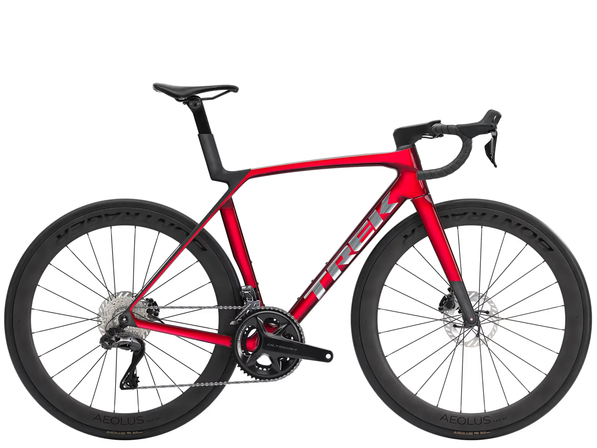 Madone 8 w całości z włókna węglowego, zwężana rura sterowa z włókna węglowego, wewnętrzne prowadzenie przewodów hamulca, hamulce tarczowe flat mount, sztywna oś przelotowa 12 x 100 mm ze skosem